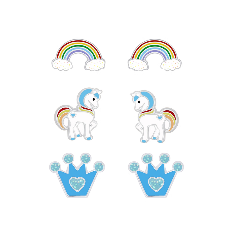 Our stunning set of Sterling Silver Unicorn Magic Stud Earrings feature three pairs of earrings. You will receive 3 pairs of earrings, Sparkle Rainbows, Colourful unicorns and Blue sparkle crowns.